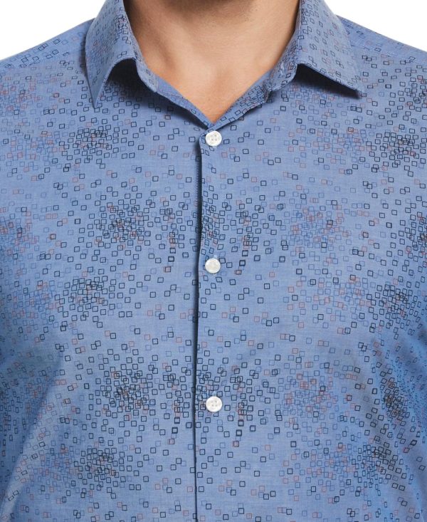 Printed with tiny squares, this Perry Ellis men’s button-down shirt is a fun option for everyday wear. The long sleeve top is made with chambray fabrication, which gives the material a two-toned mottled look. A hint of stretch provides a comfortable fit, and the design is topped off with a slim collar.