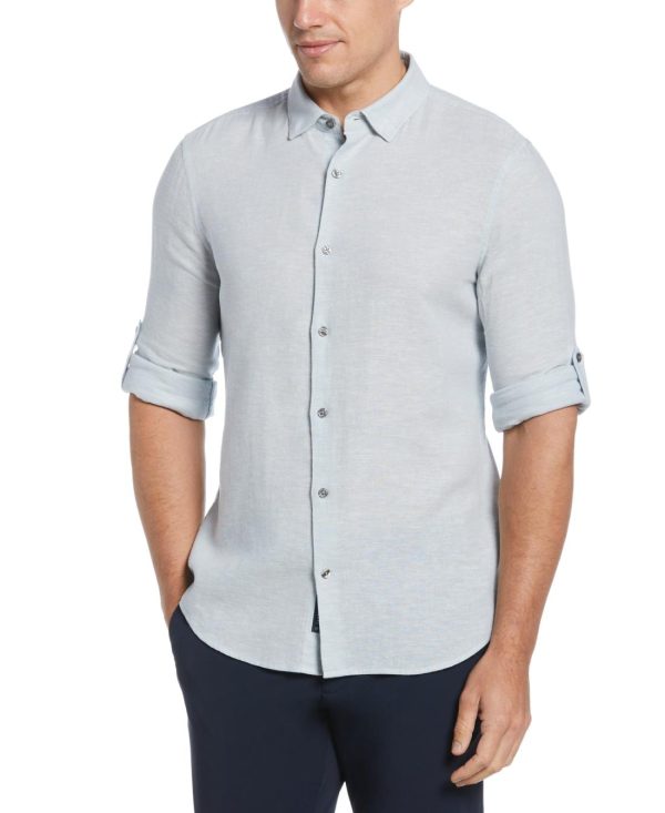 - Master the art of laidback fashion with this Perry Ellis men’s blue untucked rolled sleeve shirt. Go sleeves-up and untucked for any casual occasion while still looking tailored and fit. The linen blend plain weave fabric is enhanced with stretch to keep you comfortable all day. Wear the sleeves down at the office and roll them up at the bar after hours when it’s time to wind down.