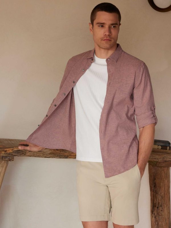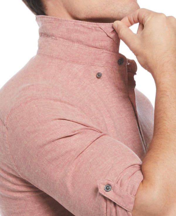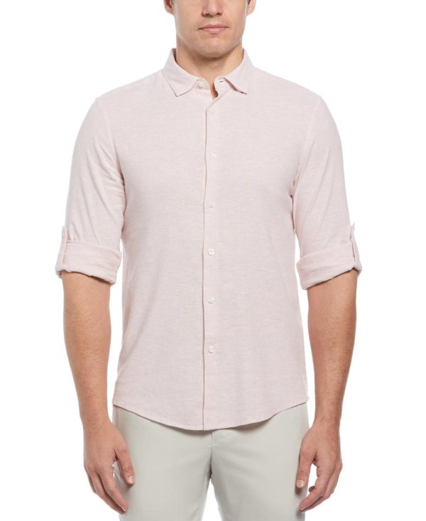 - Master the art of laidback fashion with this Perry Ellis men’s white untucked rolled sleeve shirt. Go sleeves-up and untucked for any casual occasion while still looking tailored and fit. The linen blend plain weave fabric is enhanced with stretch to keep you comfortable all day. Wear the sleeves down at the office and roll them up at the bar after hours when it’s time to wind down.