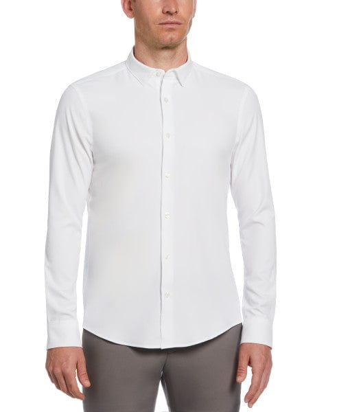 Crafted from lightweight twill fabric in a classic solid color, this long sleeve button-down shirt from Perry Ellis is a comfortable and versatile addition to any wardrobe. The men’s button-down shirt features a smart point collar and a shorter hem that’s designed for wearing untucked. Added stretch allows for a flexible fit that moves with you and the slim fit creates a clean, contemporary silhouette.